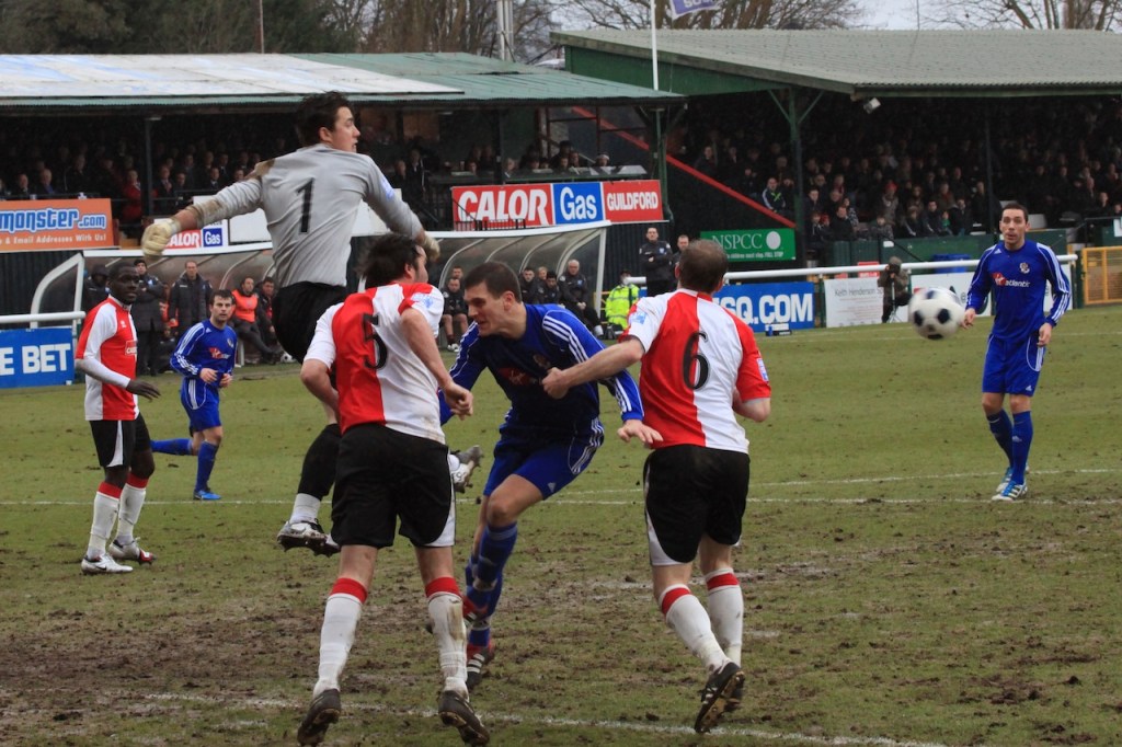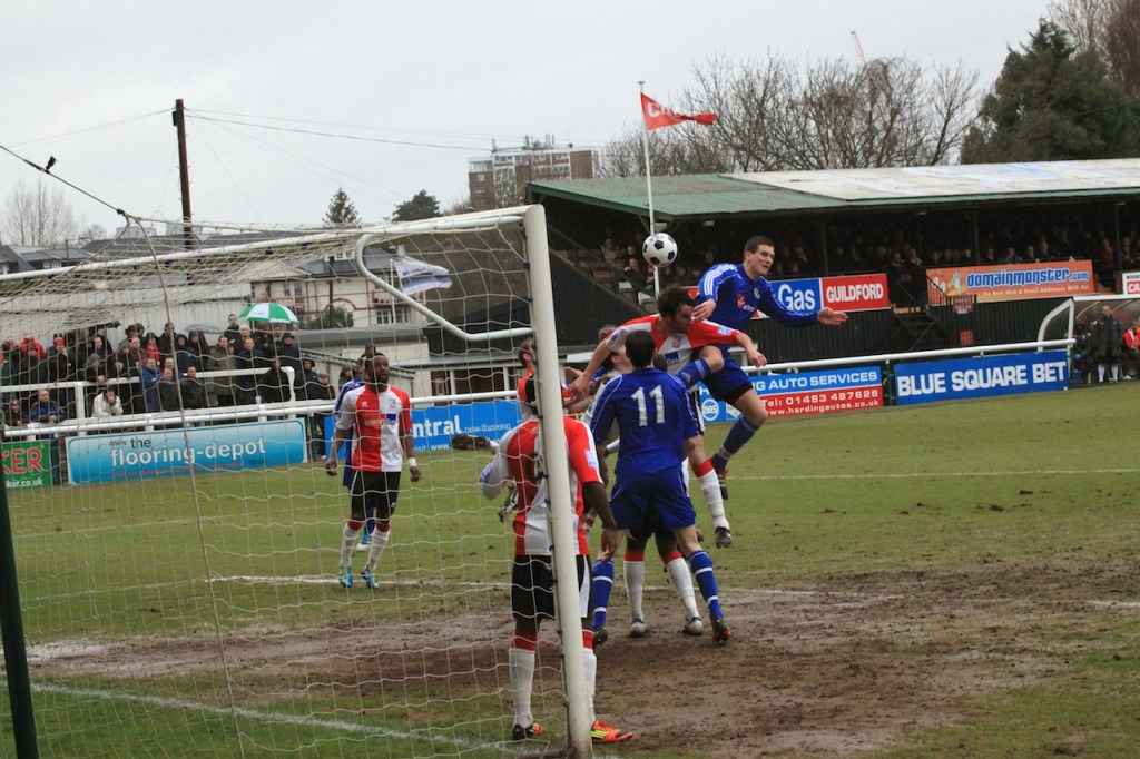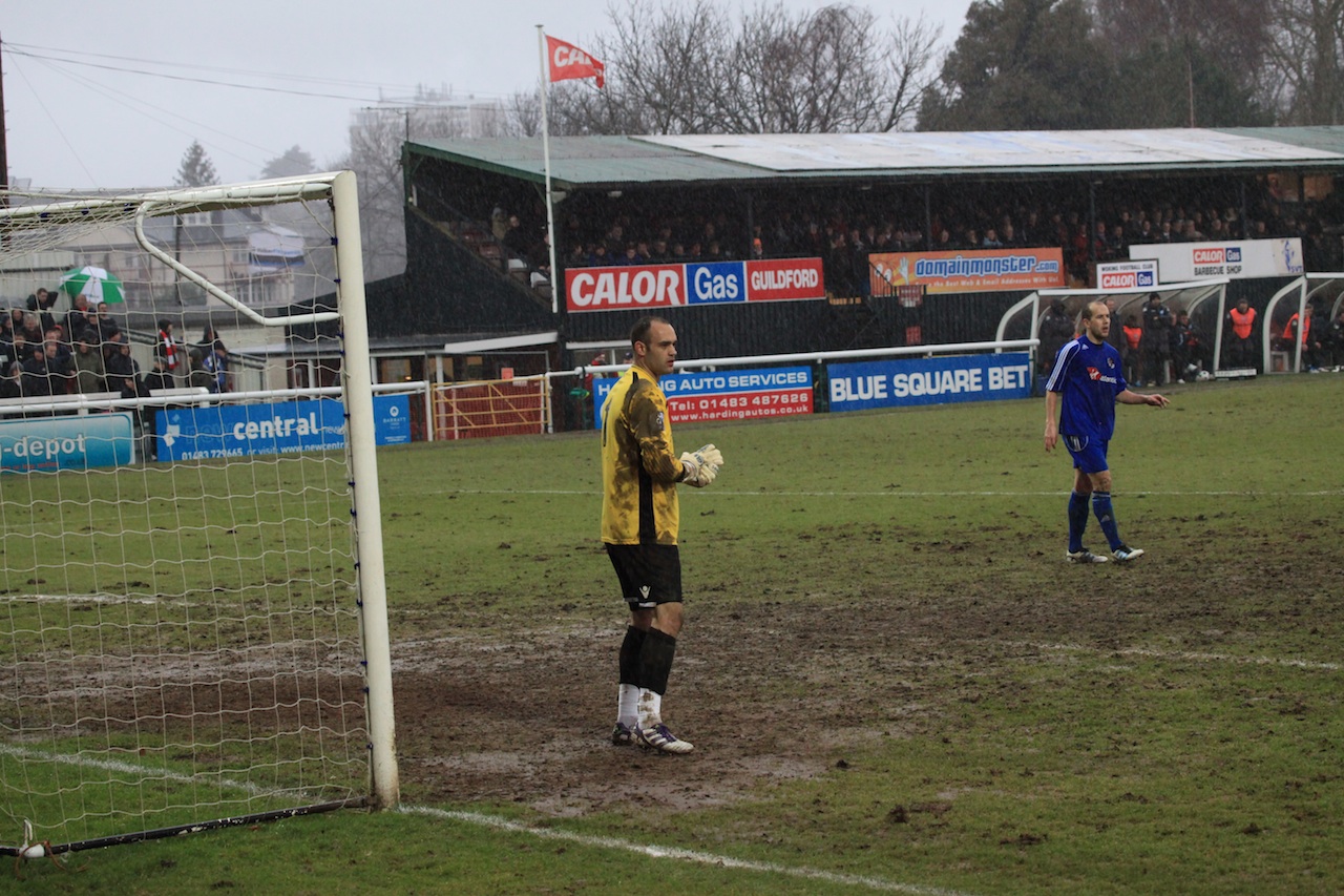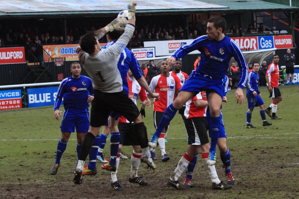 A top of the table clash in blue Square south meant a choice of game today was easy with Brentford not playing till monday night. Decent crowd of 2500 saw a tought game played mostly in drizzle but occasional downpours made conditions less than perfect. Woking is a nice place to watch a game. Entry is 12£, food is decent, certainly echelons above the rubbish served at Brentford. The last time I saw woking was the opening day of this season when they beat Sutton 5-0 at Sutton and it could have been far more, since then Woking have led the table and before todays game were 11 points clear of Dartford.