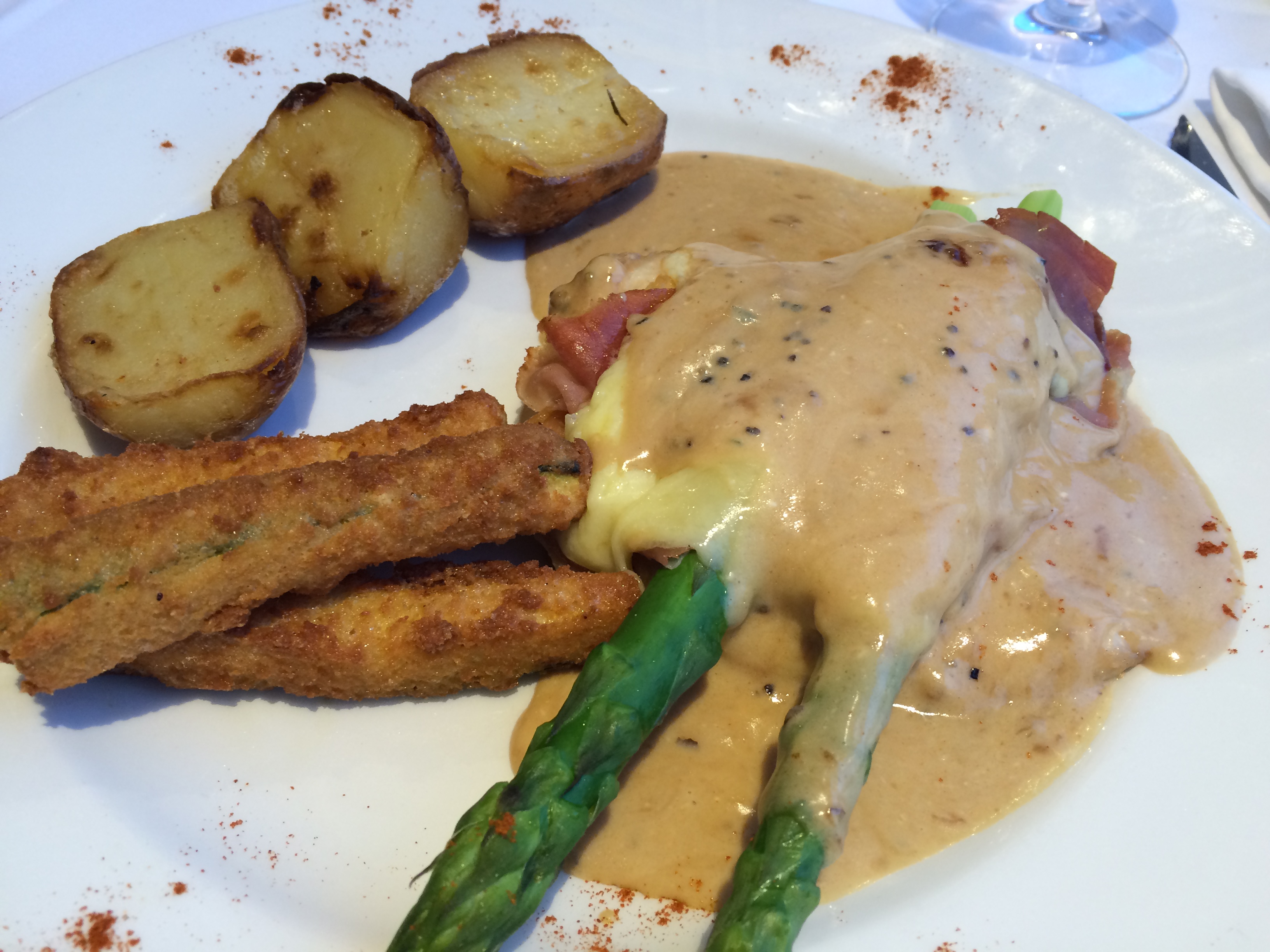 Chicken with asparagus and peppercorn sauce. Courgettes and oven potatoes.