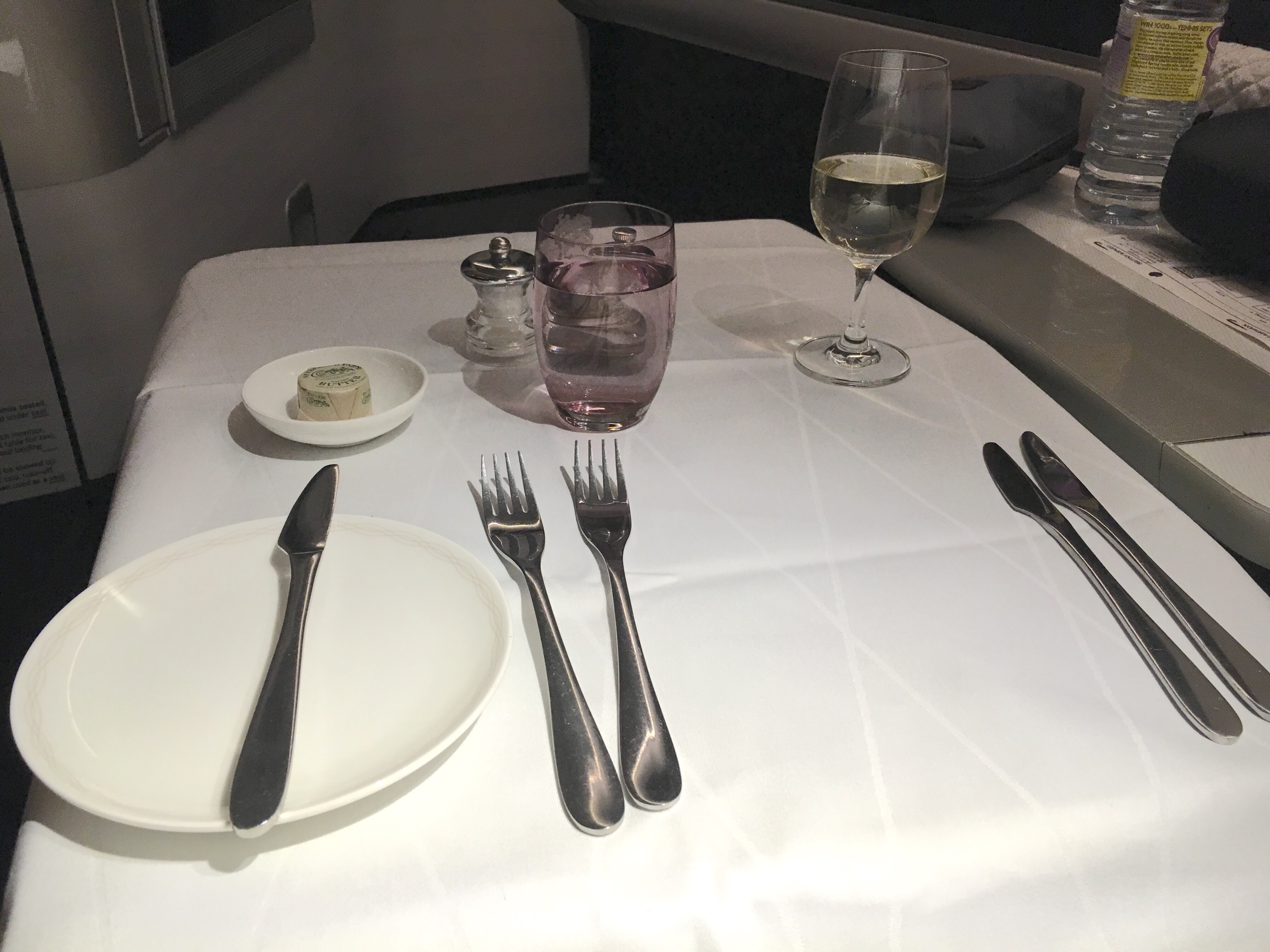 The service and the food were excellent as one might expect in first class. The menus have a variety of restaurant type choices. Pork belly and sea bass as examples. A nice touch in my simplistic world was to see a burger on the menu too.