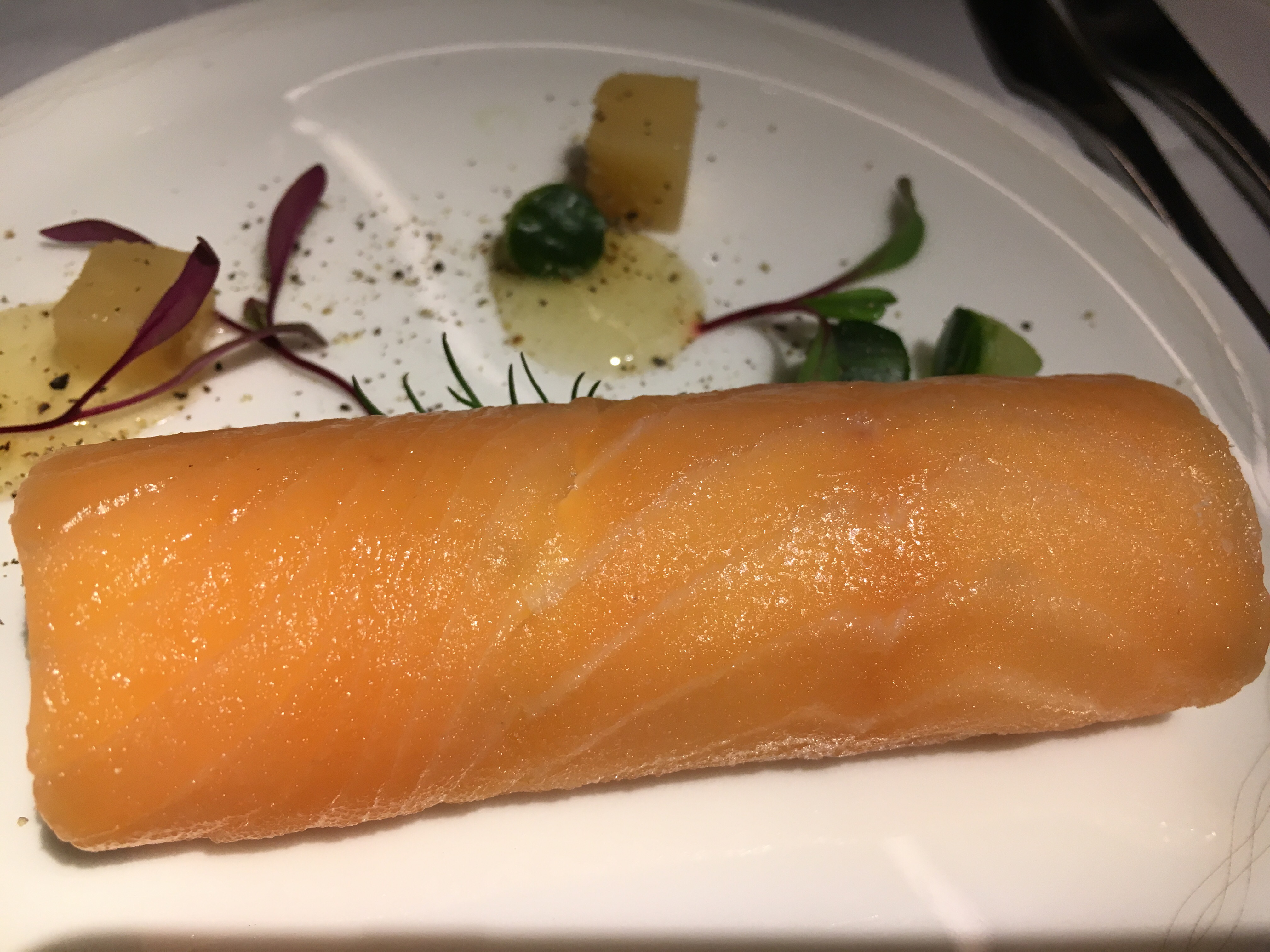 Service was fantastic. Food and drink were wonderful but one is left with the belief that there is no need for this nonsensical behaviour as normal politeness would be perfectly adequate. Dinner included food items that had not crossed my radar Such as Salmon Canneloni . But again the absurd behaviours presumably drained from a manual were there again. Upon being asked if one preferred sparkling or still water the bottle was thrust in front of you to prove they were serving the correct type. The only thing missing was a vintage . In the toilets curiously someone had left a 2 p coin on the side possibly as some type of gratuity .