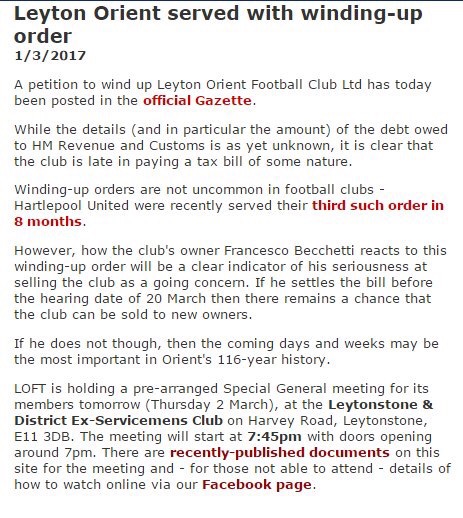 I always have been a Brentford fan and have always respected Orient. A decent club with decent fans. Struggling in the geographical shadow of West Ham. I truly hope this situation is resolved and the club is sold to someone with passion for football with some knowledge and insights. Becchetti has already rejected at least one offer. Let us hope there is someone out there who will buy Orient. The potential is there for a stable league 1 side. Liquidation is a terrible option but relegation to the National League is also not a great one . The better option is a quick sale allowing some prospect of avoiding relegation.