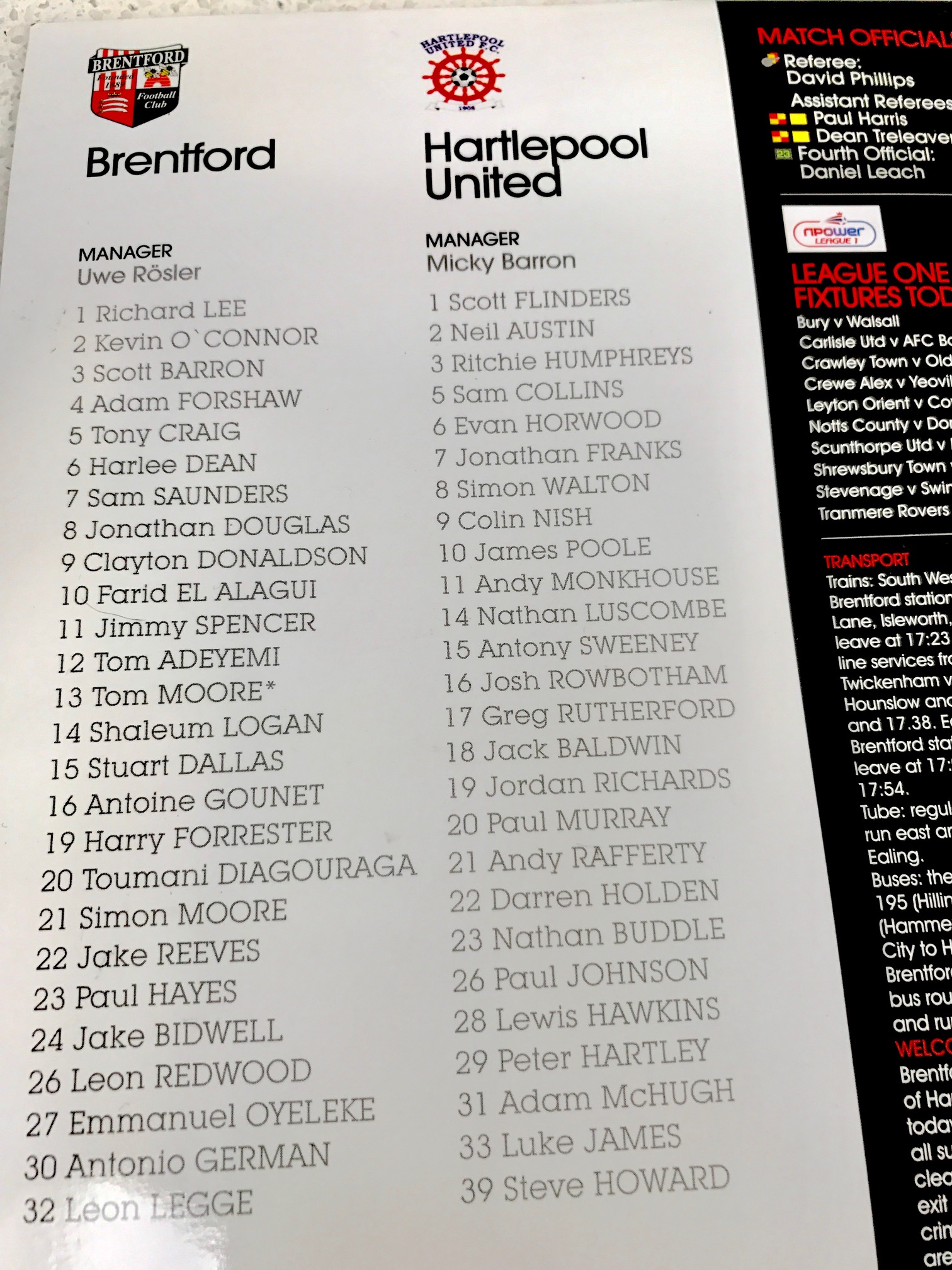 Brentford V Hartlepool. 27th October 2012. A look back.