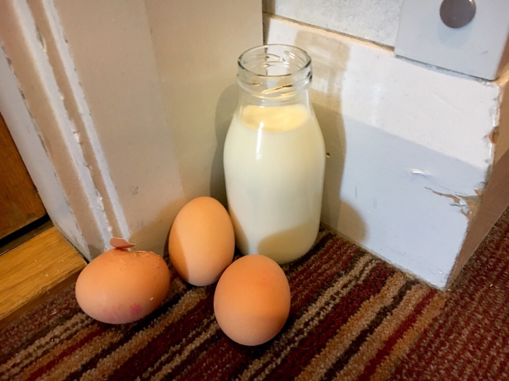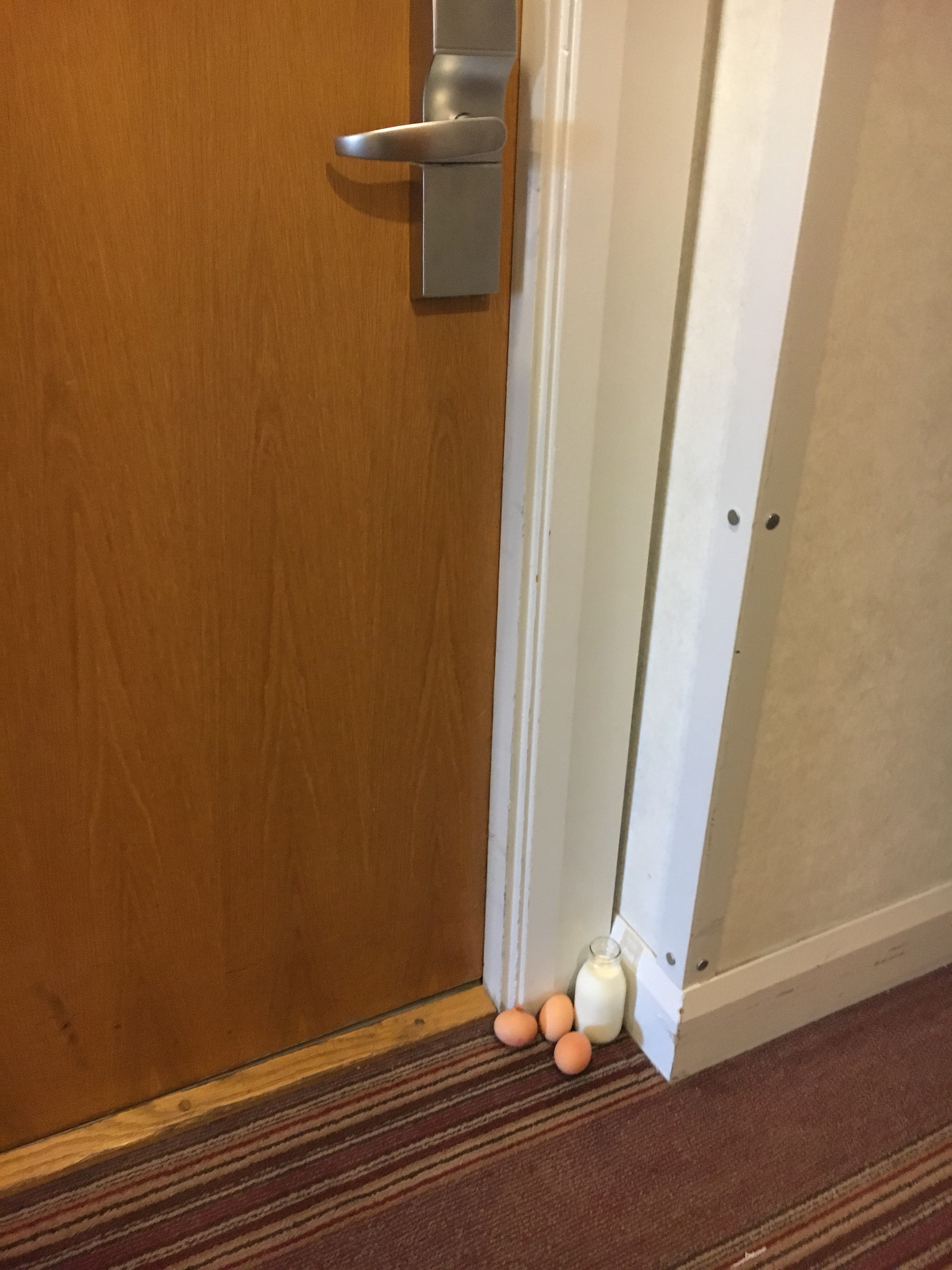 My guess is a kind friend left breakfast for someone. Or is it the cheapest breakfast ?