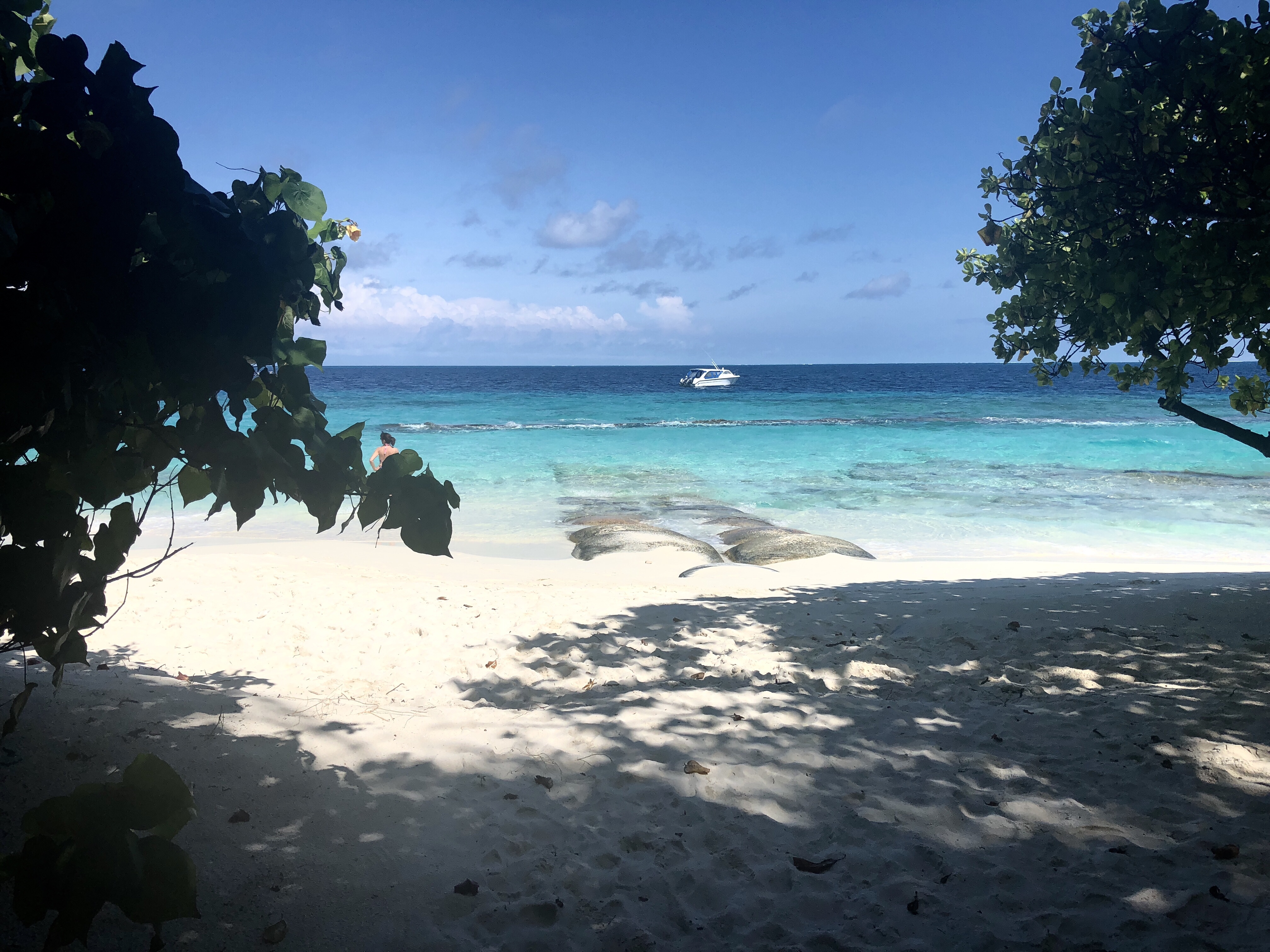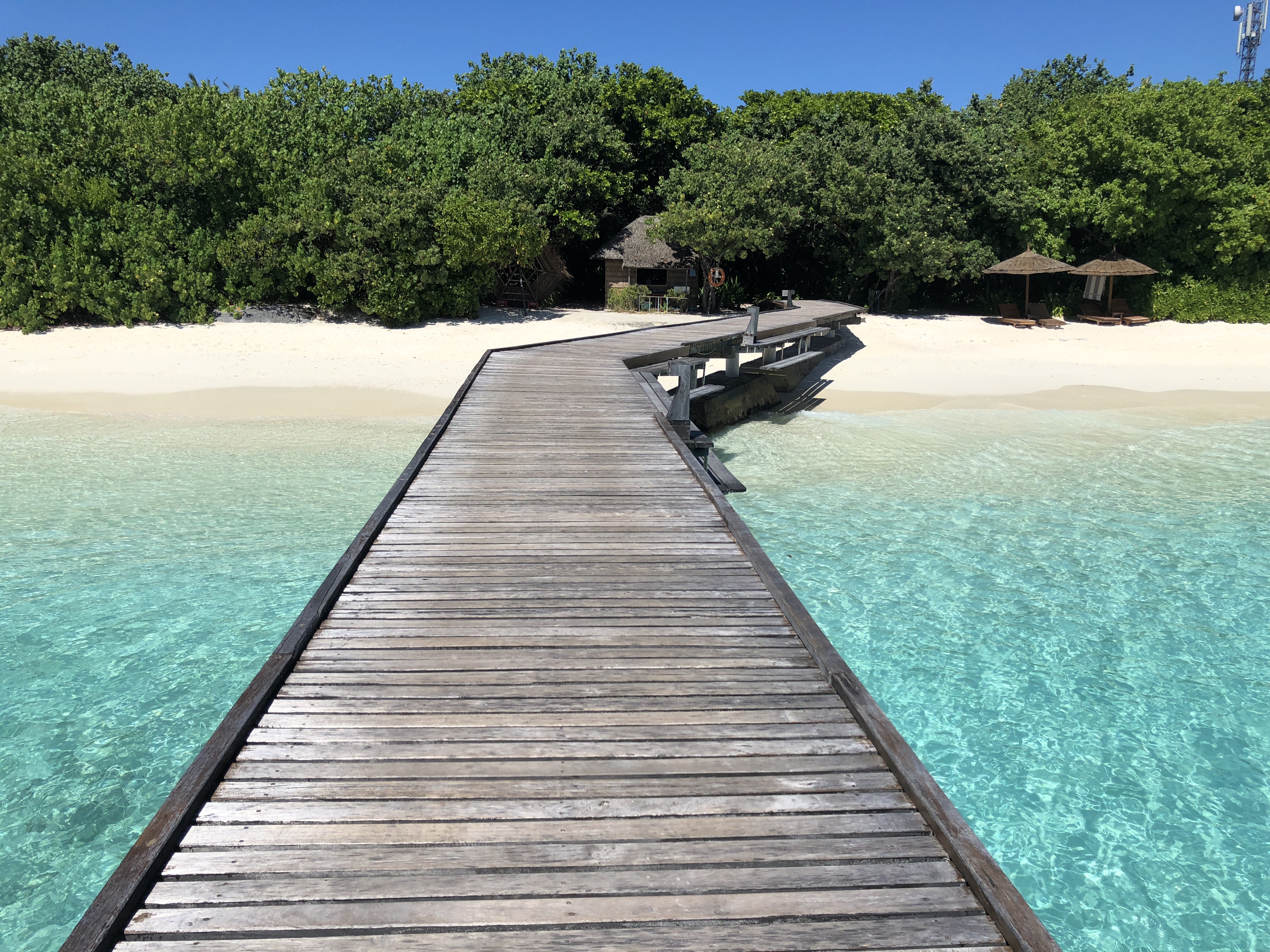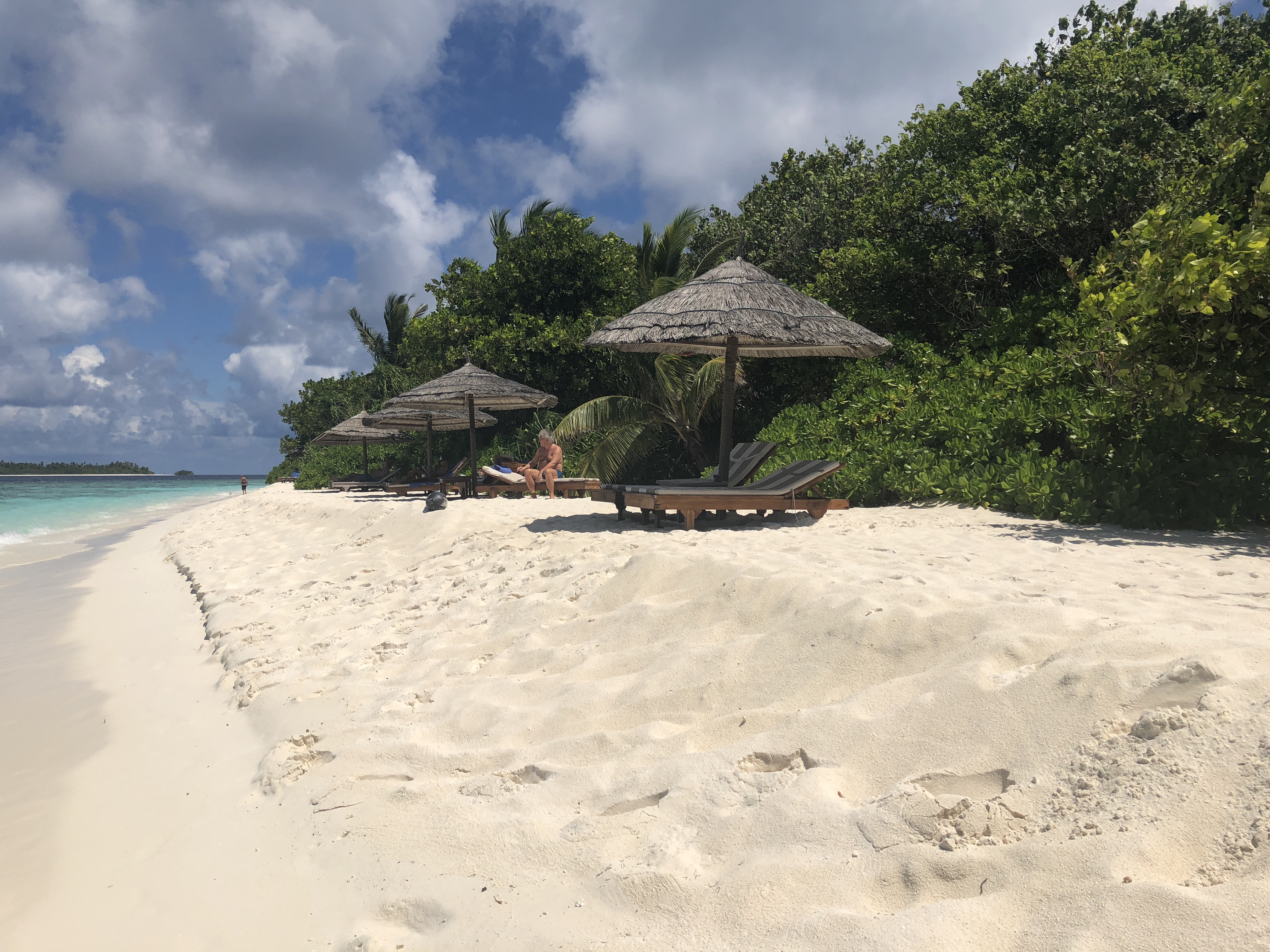 Reethi Beach is one hour ahead of Male time so it operates +5 compared to UK. The island takes maybe 30 minutes to walk around on the beaches.