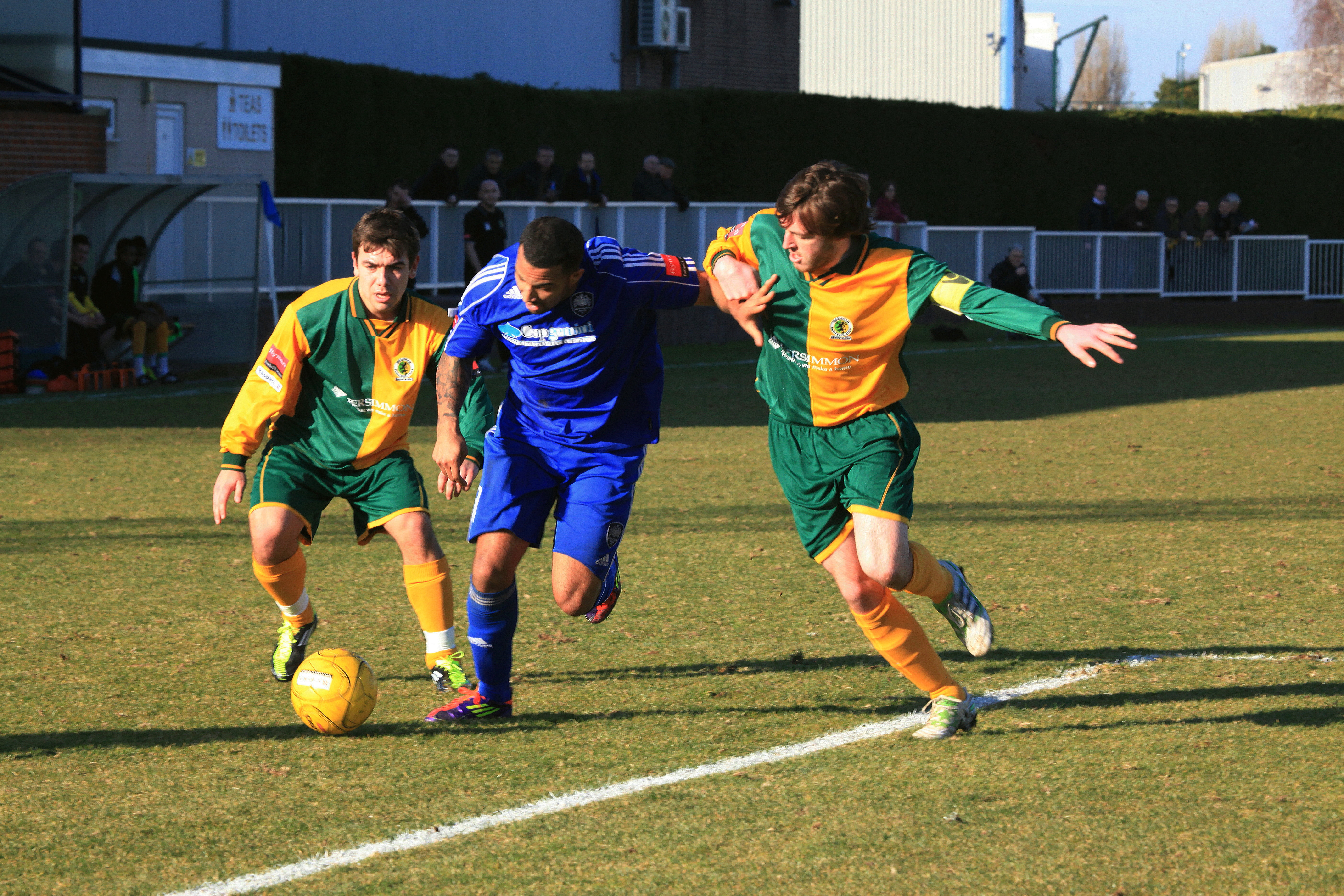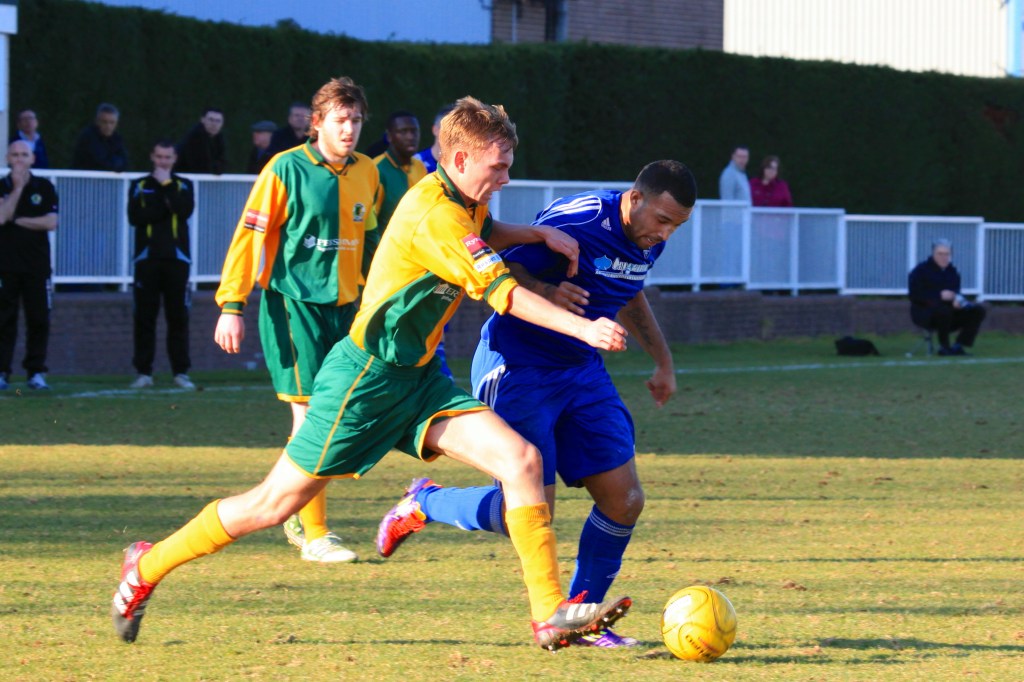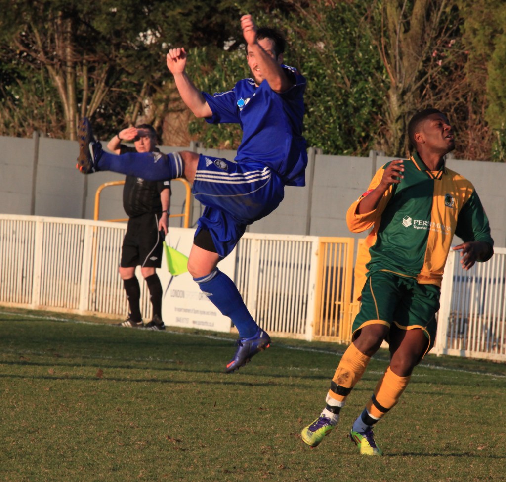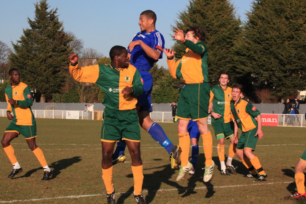 A grey day but far from a grey game. A Ryman Premier game played at a fast pace and with no little skill. The game could have gone either way with both these high-flying but inconsistent teams pushing for play-offs at a minimum. My prediction is that they will indeed meet at some stage post-season. Kingstonian, although playing at their ground, in fact groundshare with AFC Wimbledon and as a result the ground is a grand place to play Ryman League football. The floodlights also though far from perfect, are not at all bad for this level. The usual 10£ entry and 2£ for a decent programme, but £4.30 for a burger and kit-kat is a little steep, and in fact was the worst non-league burger I have sampled for some time. Before you ask, the best was Tooting.