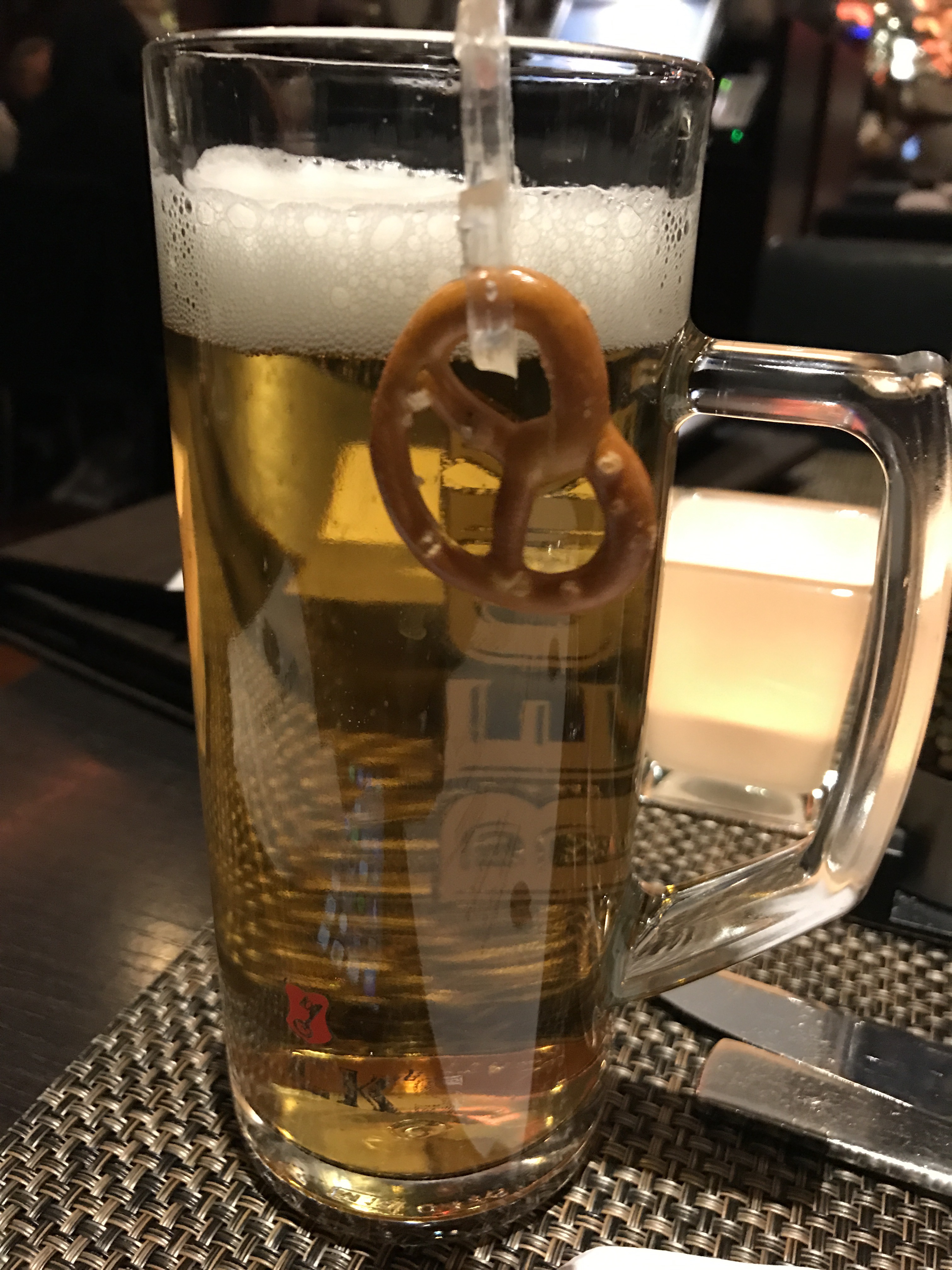 The food is interesting and despite a few little quirks, the Marriott Midtown Grill is not a bad little restaurant although not cheap. This time of year is white asparagus season. So a meal of asparagus, salmon and potatoes seems a good choice and it was. Cheesecake is always a good choice . Nice touches included free bread. In fact a small loaf really. A pretzel with the beer. And if one wanted toasted marshmallows with the bill!