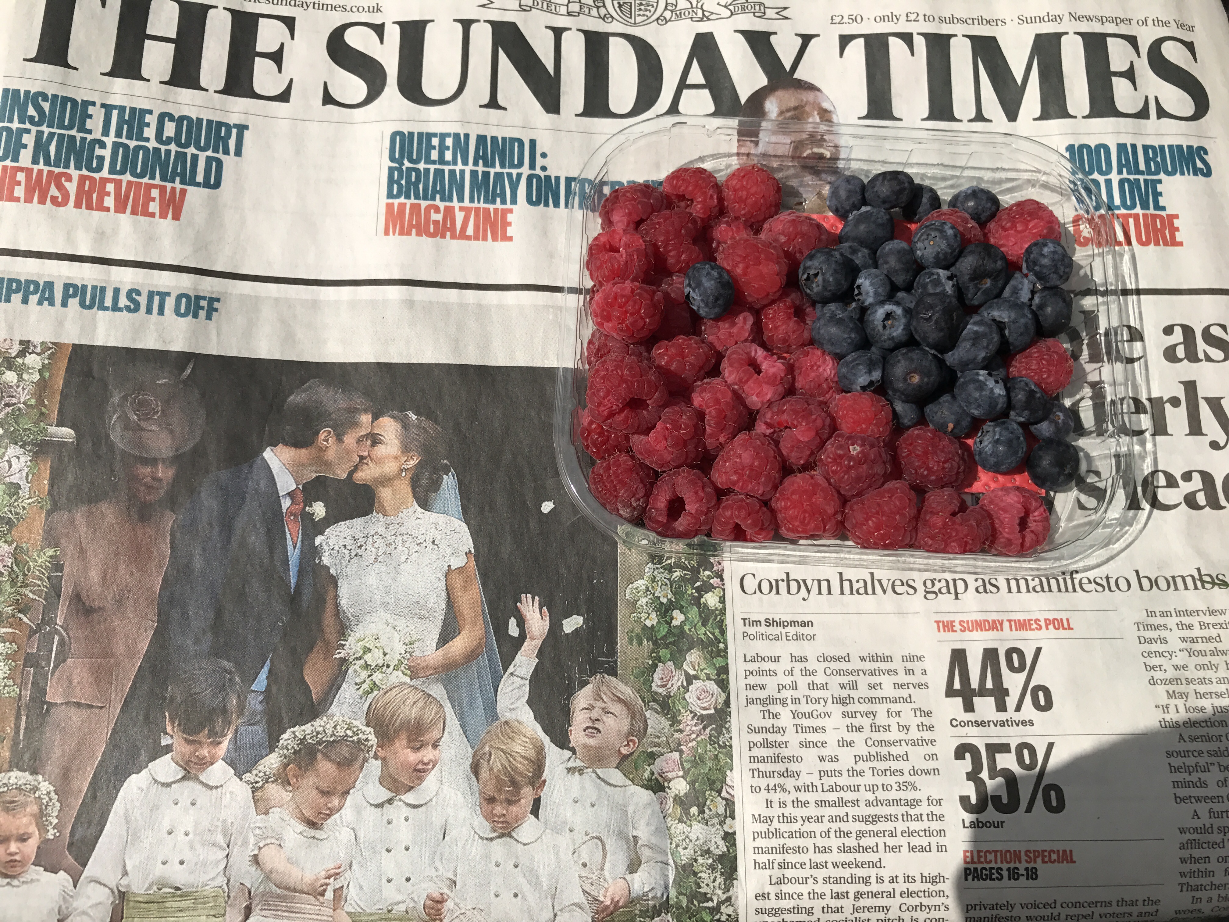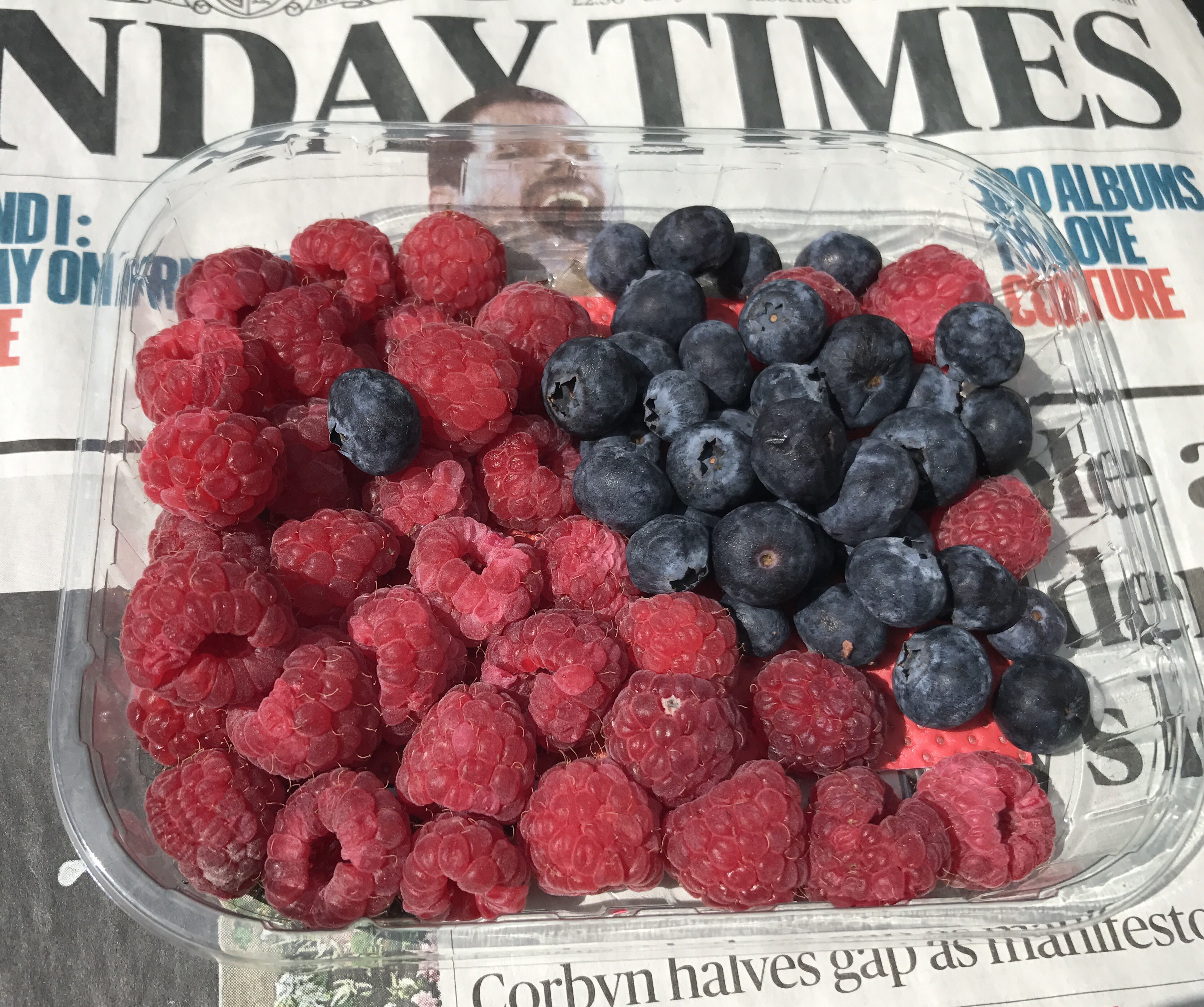 Awaking to a curiously warm and dry day meant that tea could be drunk outside with the ramblings of a newspaper. With just the humble I Phone 7 it was easy to take a photograph of some fruit sitting on the newspaper. It was only when I looked at the photograph I saw that it seemed Freddie Mercury was in my raspberries. Never seen that headline before.