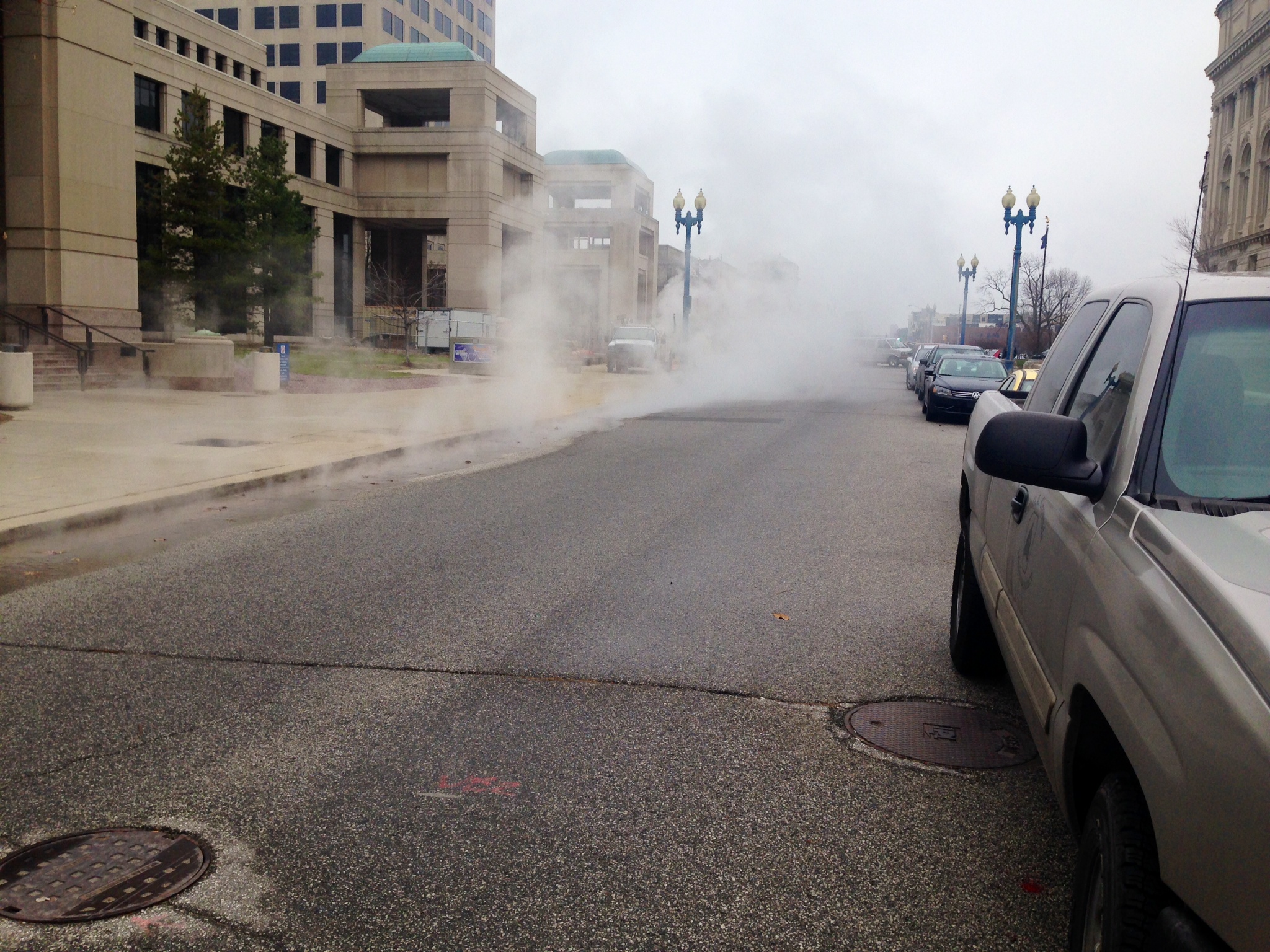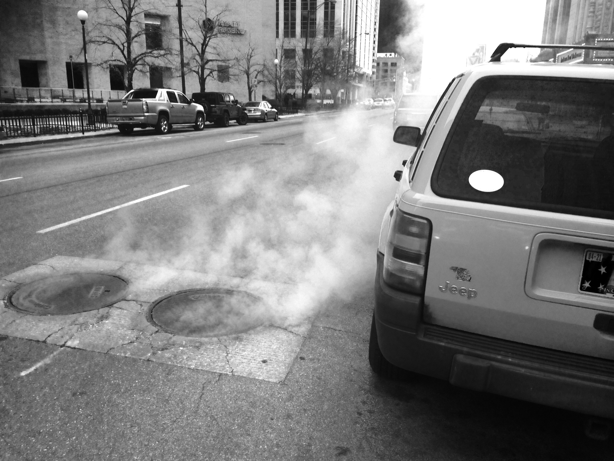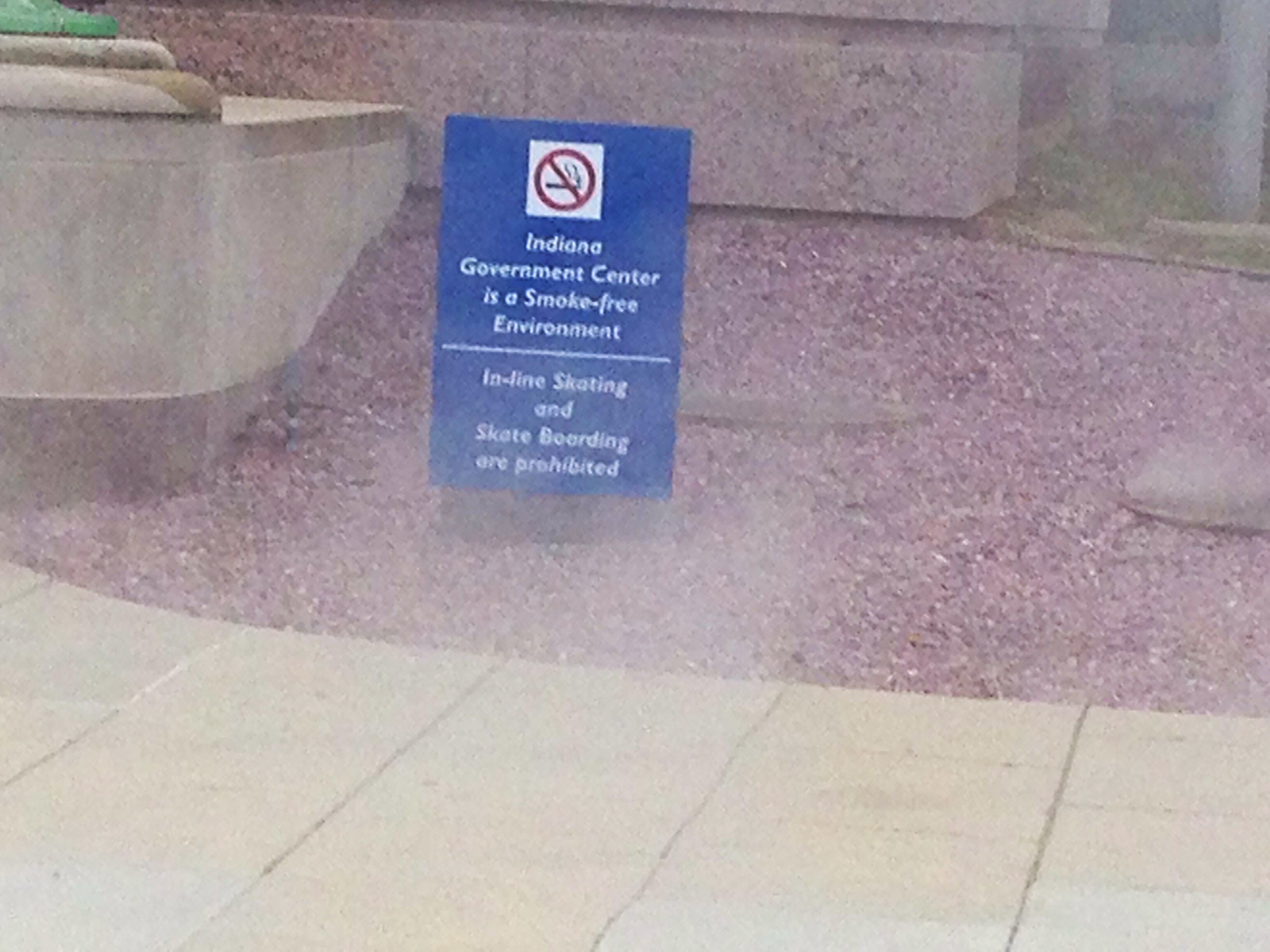 Then there is the steam that emanates from all drains in Indianapolis. What were my findings today? Well firstly the steam does not smell. Secondly it looked like a re-make of that film “The Fog” in places. Thirdly, outside the equivalent I think of the County Council offices there was a sign eulogising ” no smoke”. Sadly also they forgot to ban steam.