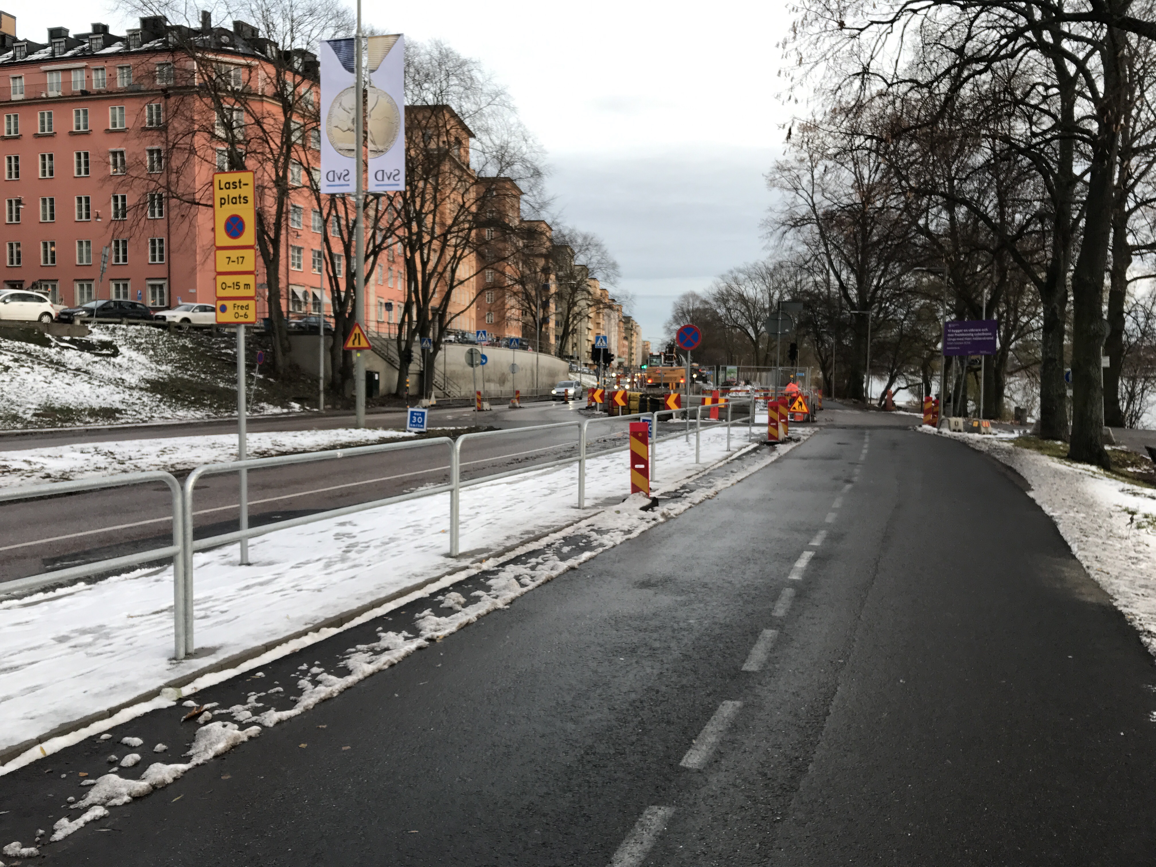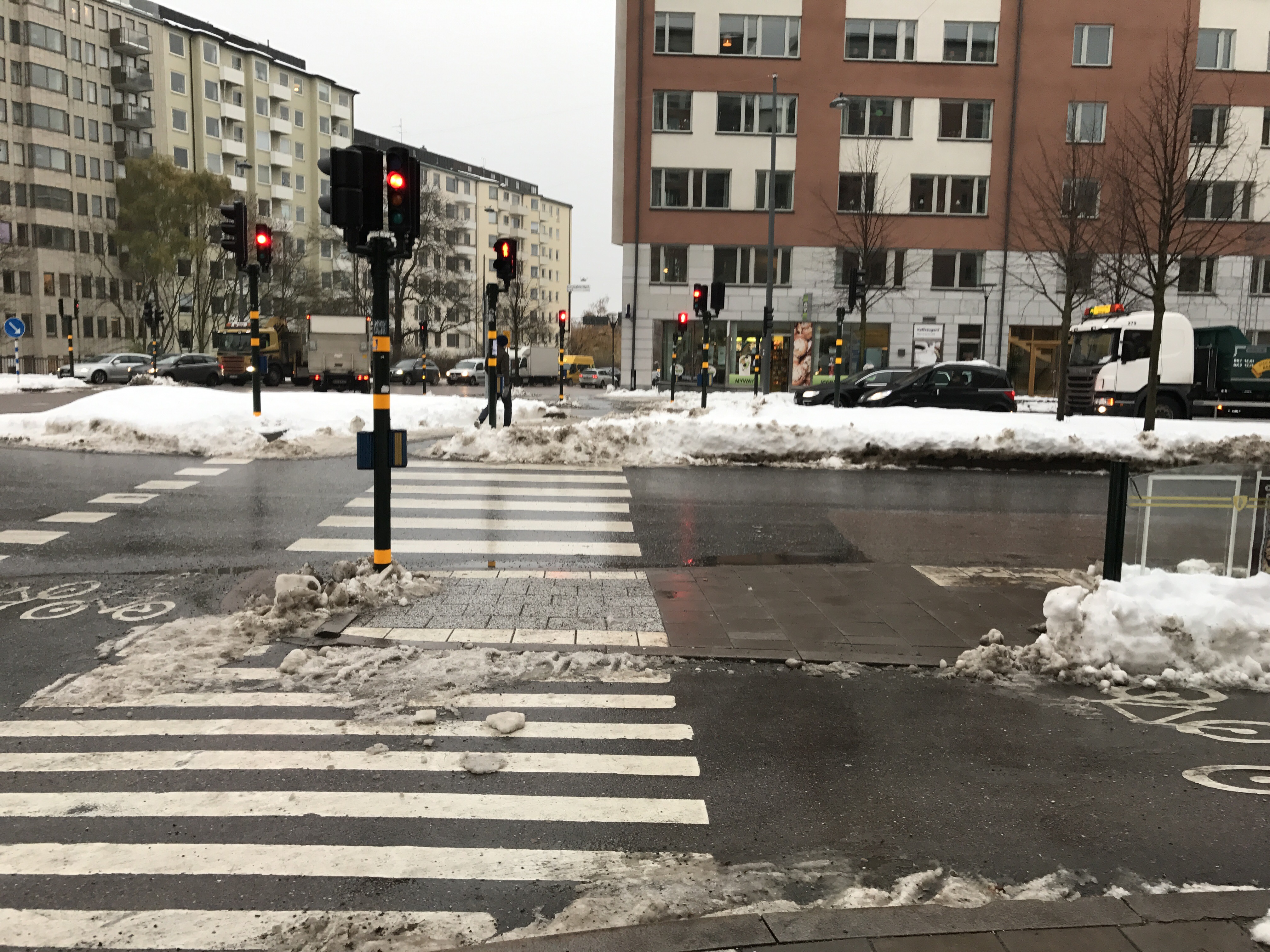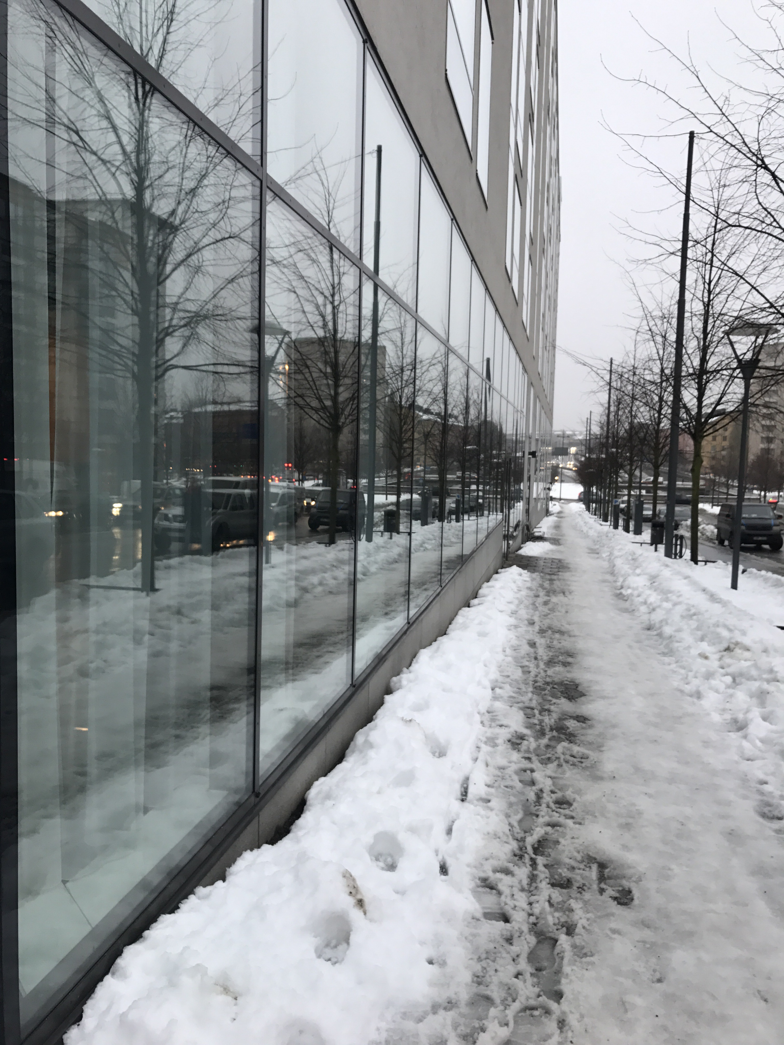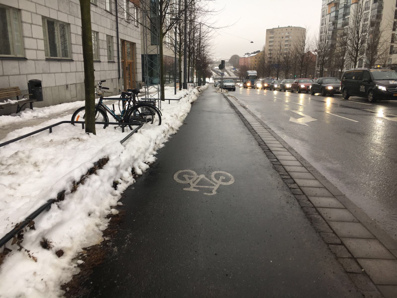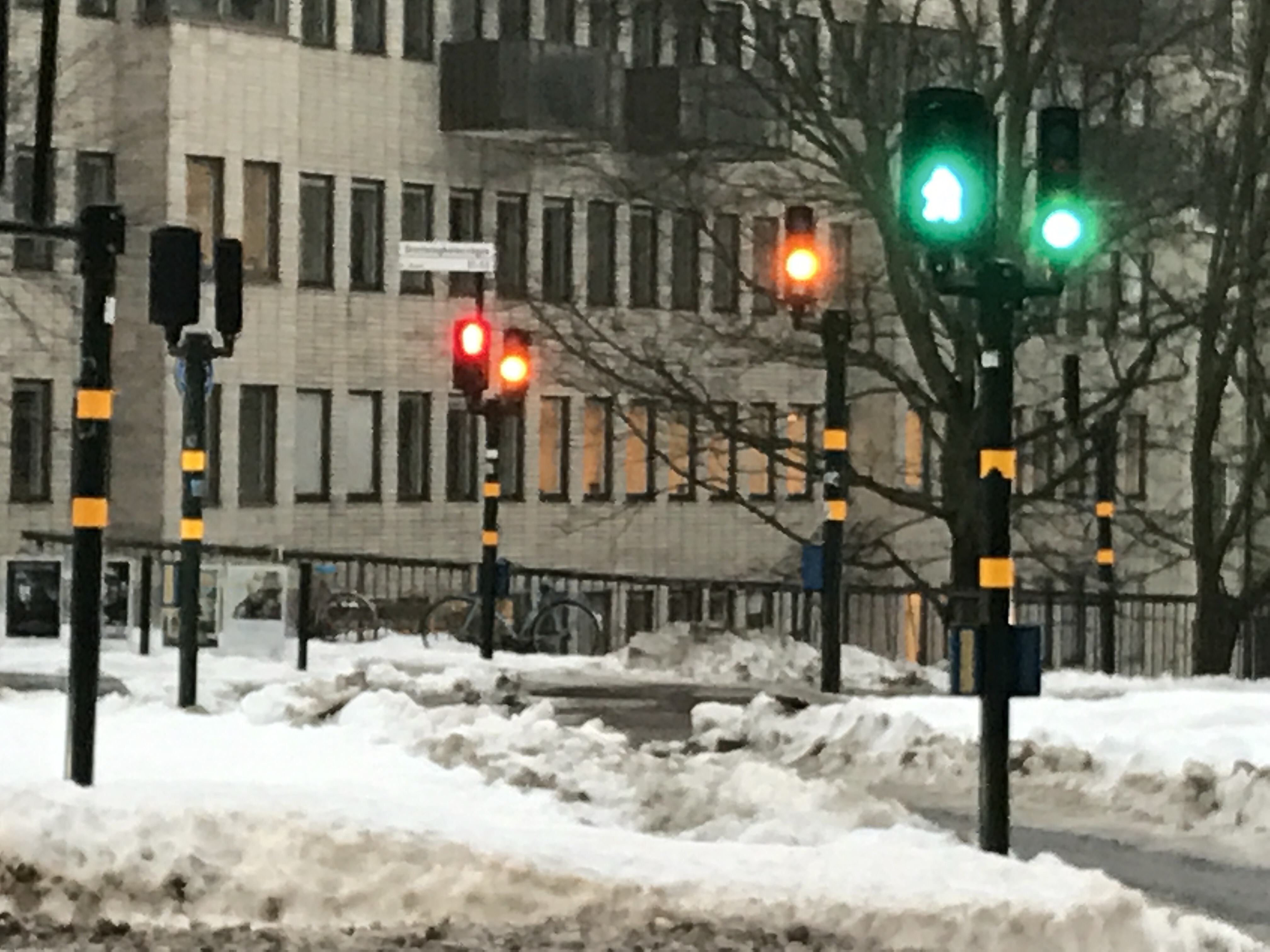 The people look cold. Walkways are not easy to use with only the bicycle lanes having made friends with the salt or grit.