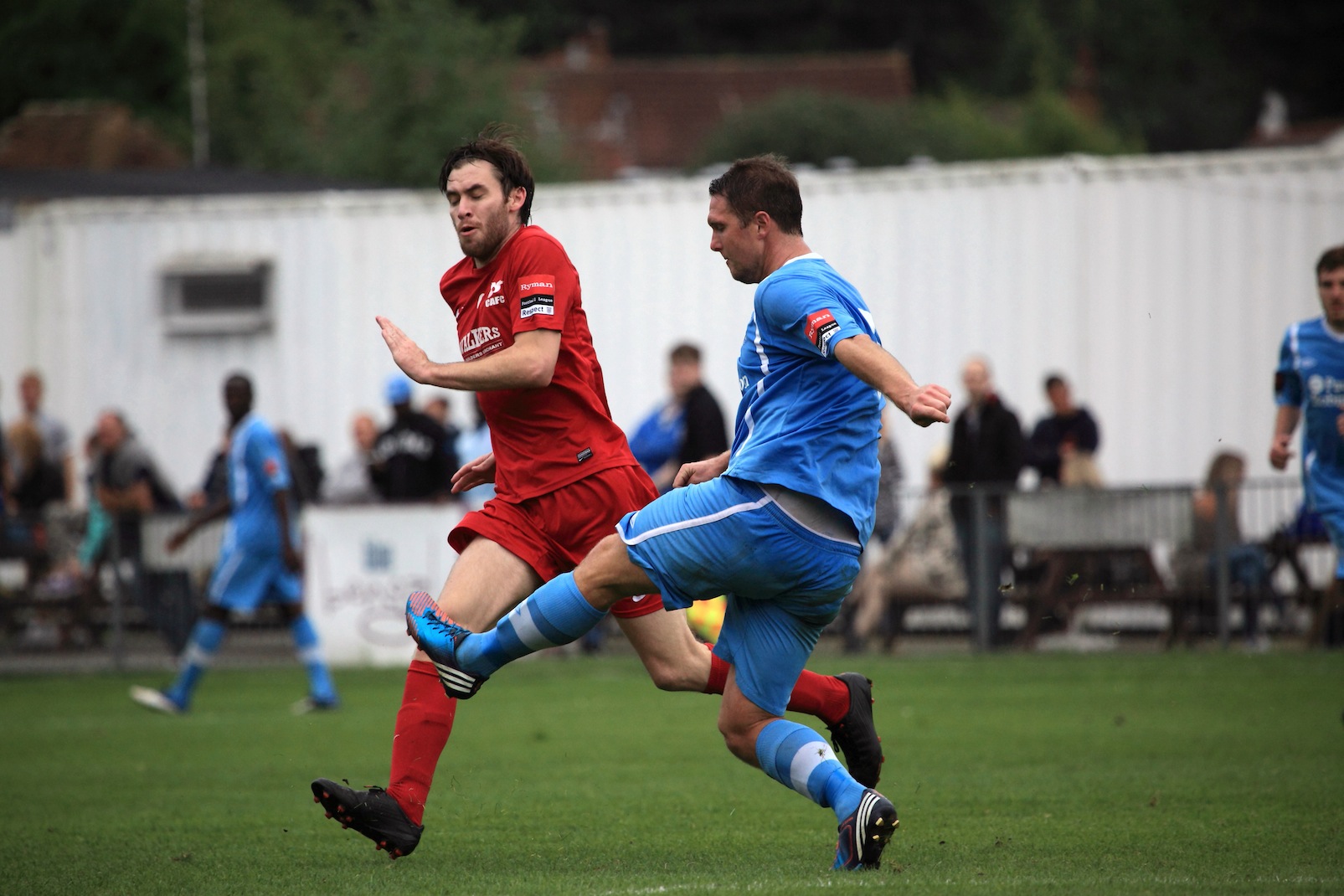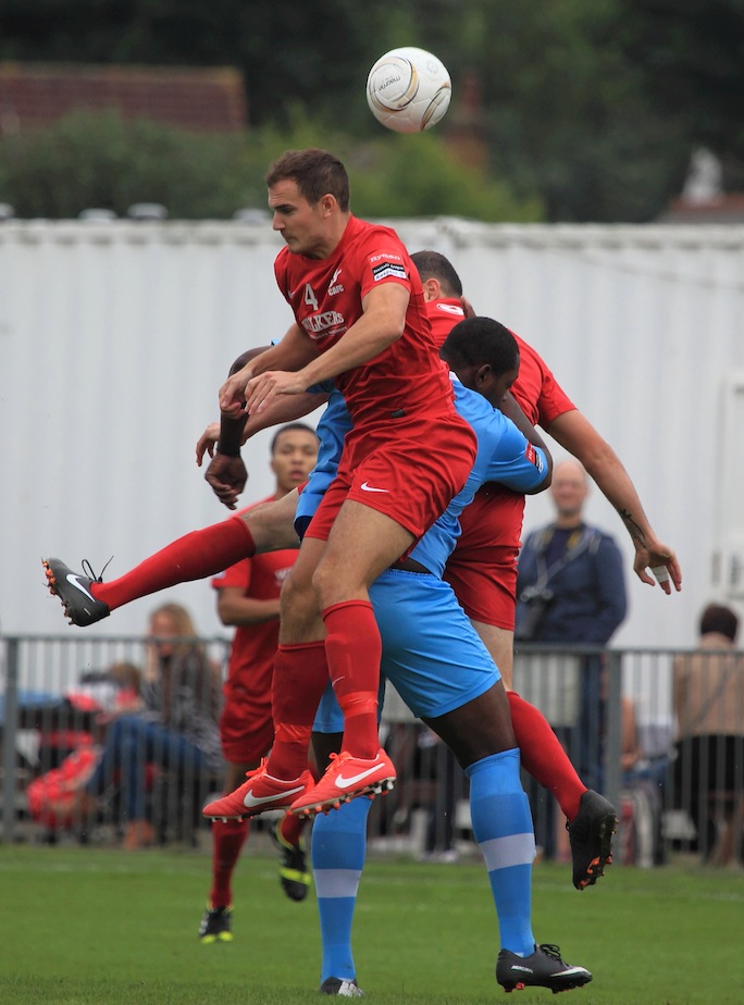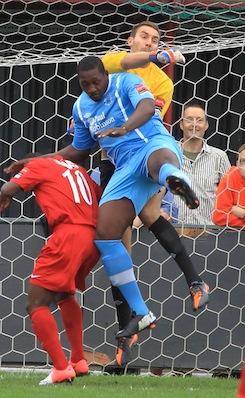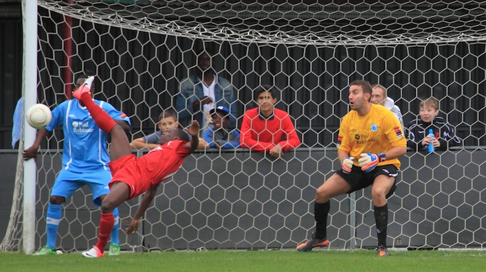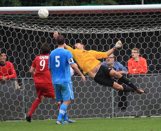 An entertaining Ryman premier league game that saw Carshalton win their first home game of the season. the reality of the game was that in the first half Carshalton should have been at least 3-0 up and that in the second half Billericay should have scored. That they did not says much about the staunch defending from Carshalton combined with excellent usage of the substitutes. This is a young Carshalton team and they will improve.  From the photos I leave it you to count the number of impressive kung-fu moves in the penalty area and in the whole series of photos there were plenty of shirt pulling episodes, all missed by the referee and his team.  Carshalton is friendly place to watch football and the football played yesterday was actually exceptional at this standard by both teams.  Good movement off the ball, intelligent running and some decent tacking too.  Players who really impressed yesterday included Kieran Woodley, number 11 who scored a decent goal and tommy Bradford number 7 who never stopped running all afternoon.  Maybe the oddest thing though is that man of the match would have to go to the Billericay goalkeeper Billy Lumley. Great saves throughout.  Game stayed interesting right until the end when Ricky Sappleton was sent off for two yellow cards around 10 seconds before fulltime.